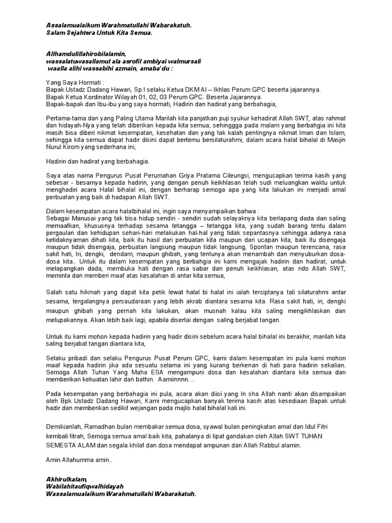 142 Sambutan Tuan Rumah. Nah kita sebagai warga yang ikut kegiatan tersebut kadang ditunjuk sebagai pembawa acara dan mau. Haris Setiawan selaku pembina takmir masjid al-hurriyah. Arab Inggris Jawa Singkat Halal Bihalal Virtual Keluarga Besar MTsN 6 Bantul - Website Kementerian Agama RI Kanwil DIY Contoh Pidato Agama. Contoh teks MC acara halal bihalal.